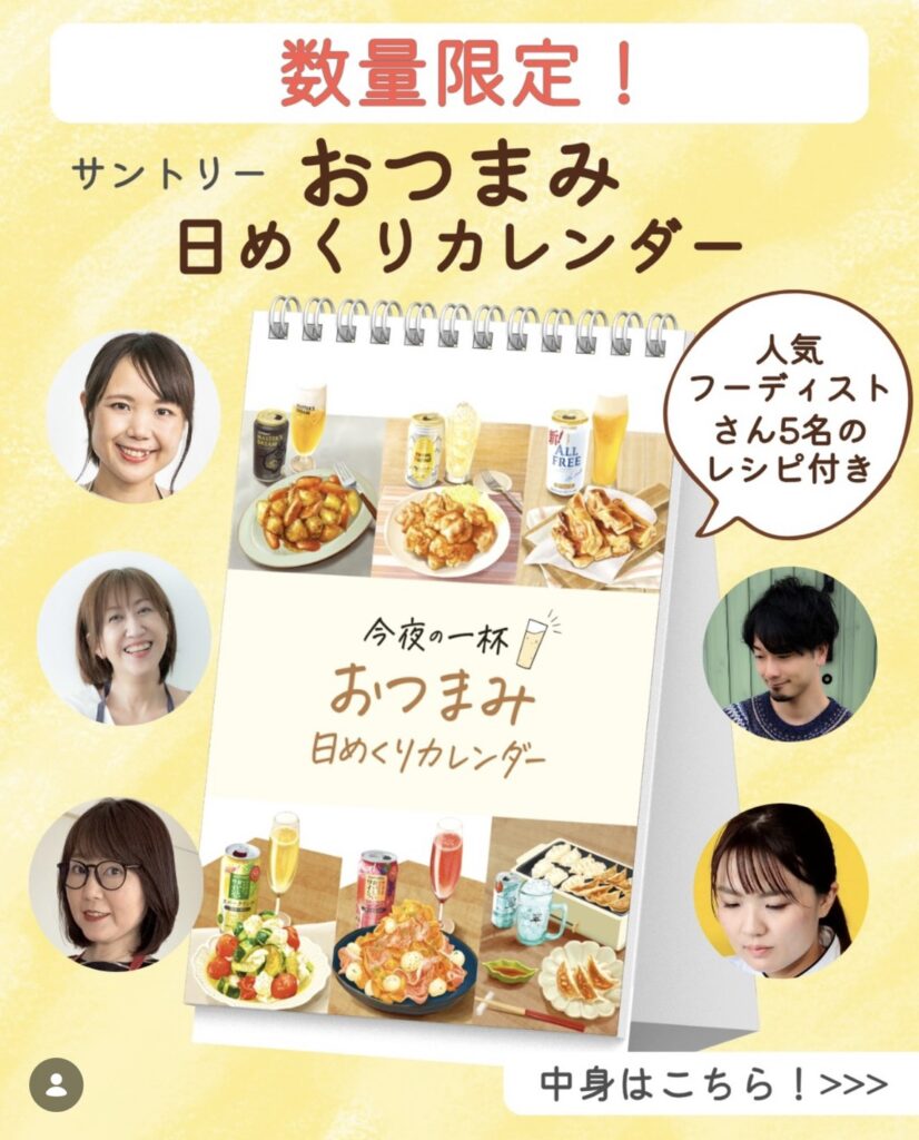 【レシピ開発】サントリー様おつまみカレンダーのレシピ考案 レシピ開発・撮影 2025/12/1 サントリー様のお酒たちを日めくりで楽しめる“おつまみカレンダー”の、オールフリー担当として6つのレシピを提供しました。